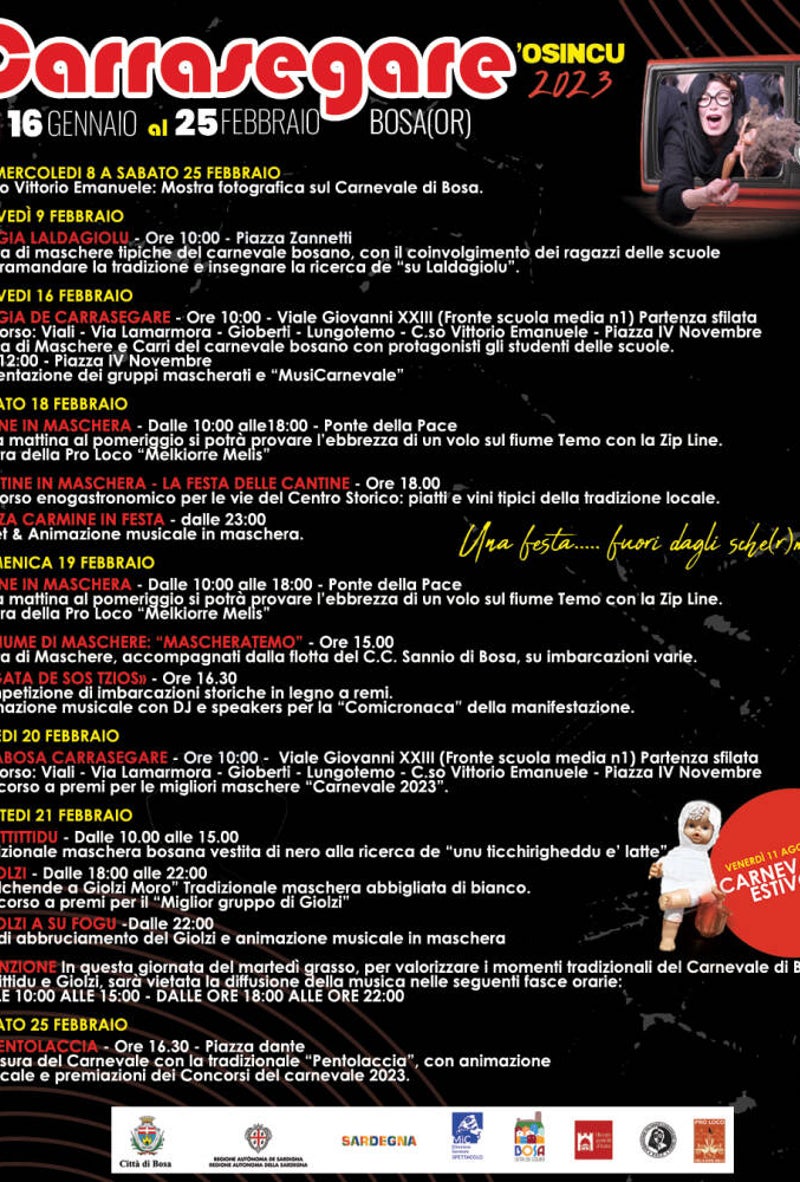 Je zou het niet zeggen als je Bosa op een rustige zomerochtend bezoekt, maar tijdens carnaval staat ook dit dorpje op zijn kop! Het carnavalsfeest, dat zes dagen duurt, wordt uitbundig gevierd, met als belangrijkste kostuum dat van Is Attittadorasa, waarbij mannen zich uitdossen als weduwen, terwijl ze klaagliederen zingen.